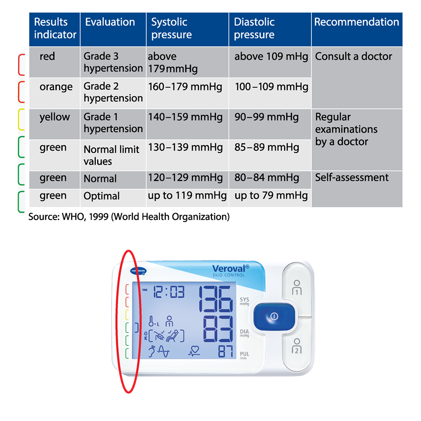 لتقييم النتائج بشكل أفضل، يصف نظام ألوان الإشارات الضوئية الموجود على يسار جهاز فيروفال® أبر آرم النتائج مباشرة بحسب تصنيف منظمة الصحة العالمية (WHO) لقيم ضغط الدم.