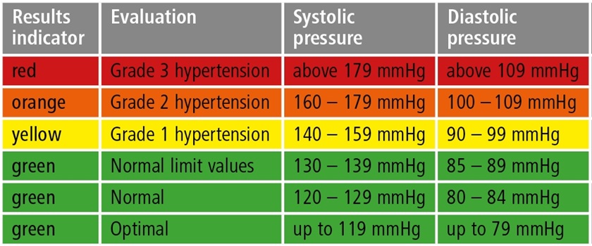 Για την καλύτερη αξιολόγηση των αποτελεσμάτων, τα πιεσόμετρα Veroval® διαθέτουν ένα σύστημα χρωματικών ενδείξεων που περιγράφει άμεσα τα αποτελέσματα, διευκολύνοντας την κατηγοριοποίηση της μετρηθείσας τιμής. Ο Παγκόσμιος Οργανισμός Υγείας (ΠΟΥ), καθώς επίσης η Ευρωπαϊκή Καρδιολογική Εταιρεία (ESC) και η Ευρωπαϊκή Εταιρεία Υπέρτασης (ESH), έχουν καταρτίσει την ακόλουθη σύνοψη για την ταξινόμηση των τιμών της αρτηριακής πίεσης: