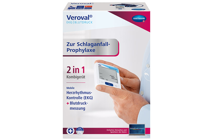 A Veroval® mobilEKG- és vérnyomásmérő készülékkel bárhol és bármikor rögzítheti szívritmusát, amikor tüneteket észlel (pl. heves szívverés, légszomj, mellkasi fájdalom), emellett rendszeresen mérheti a vérnyomását is. A Veroval® kombinált készülék könnyen érthető információkat nyújt az eredményekről.